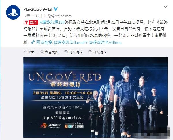 [size=15.9996px]相信广大的《最终幻想》系列粉丝们等待跳票了10年的《最终幻想15》已经望穿秋水了吧。 [size=15.9996px]今天,Xbox One与PS4的官方微博同时爆料称,《最终幻想15》将在3月31日早上于美国洛杉矶召开全球发布会,同时这次的FF15非常有可能在中国同步上市,发布会将公布游戏的详细情报与上市时间,大家可以共同响应应水晶的召唤,一起见证FF系列的浴火重生。