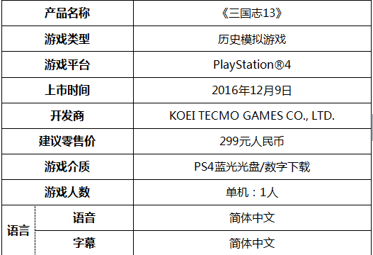 [size=15.9996px]索尼互动娱乐(上海)有限公司和上海东方明珠索乐文化发展有限公司今日宣布,将于2016年12月9日在中国大陆市场推出PlayStation®4(PS4TM)简体中文版游戏《三国志13》,游戏建议零售价为299元人民币。12月2日起开放预约,预约渠道包括:PlayStation®天猫官方旗舰店、索尼中国直营店、索尼中国在线商城、索尼天猫官方旗舰店、京东、PlayStation®天猫官方授权店(汉王数码专营店、索贵数码专营店)、PlayStation®官方授权店(北京崇文门搜秀商城店、重庆大坪时代天街Game Time店、上海星辰电玩、成都海豚电玩百脑汇店、厦门UpGame、深圳IGE皇庭世纪店、北京酷玩e代店、武汉新恒辉电玩店、杭州玩出名堂店、南京丽利电玩、成都天空电玩、广州中舜广百店、沈阳百脑汇电玩巴士、杭州精灵电玩,北京功夫盒子蓝色港湾店、北京功夫盒子五彩城店、上海颐高盛天、上海东骏电玩、重庆电玩地带)、神州数码、伟仕及德富通授权经销商等渠道。